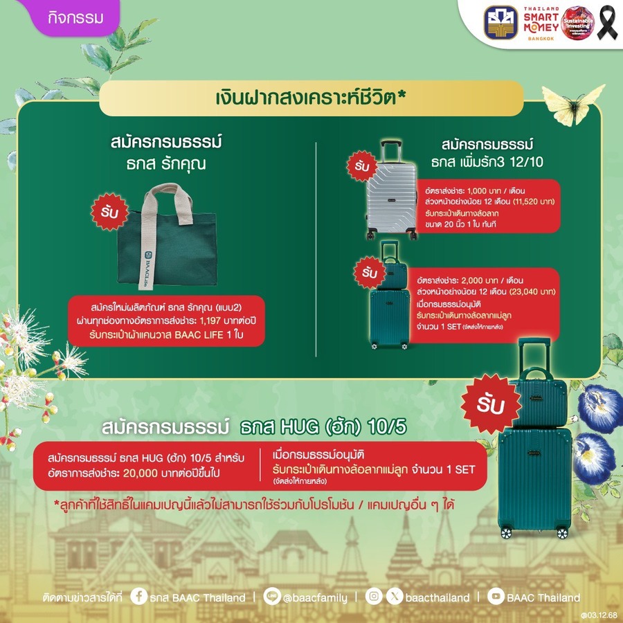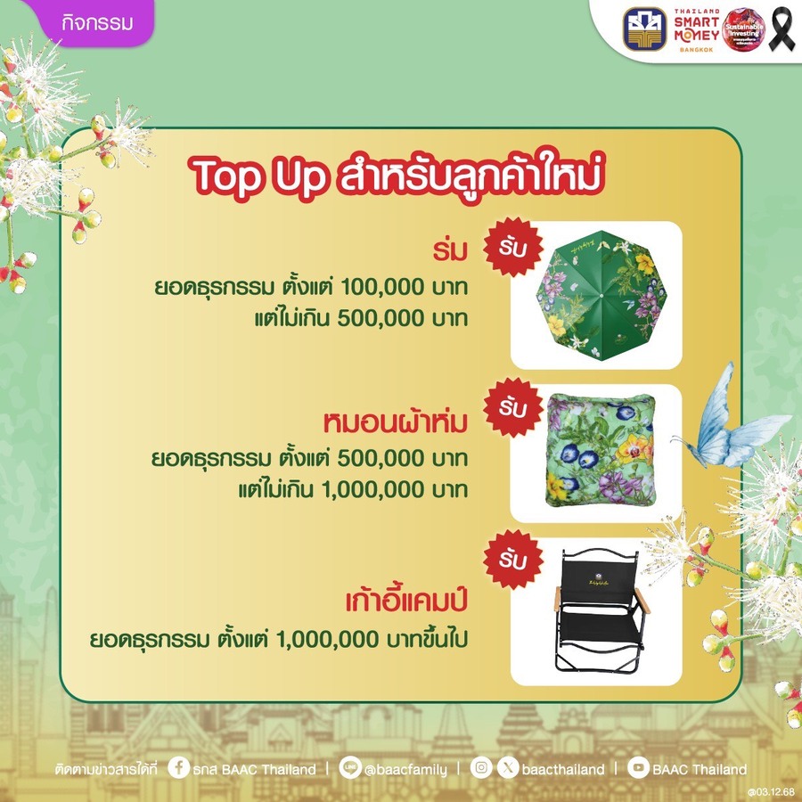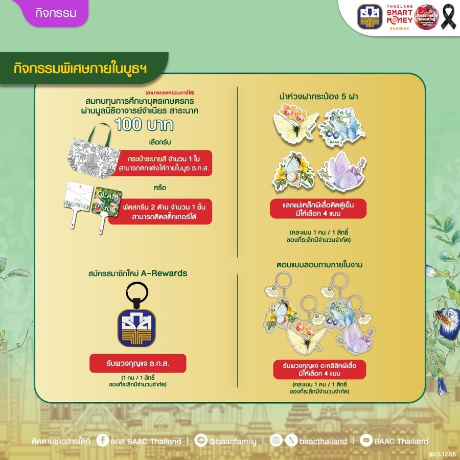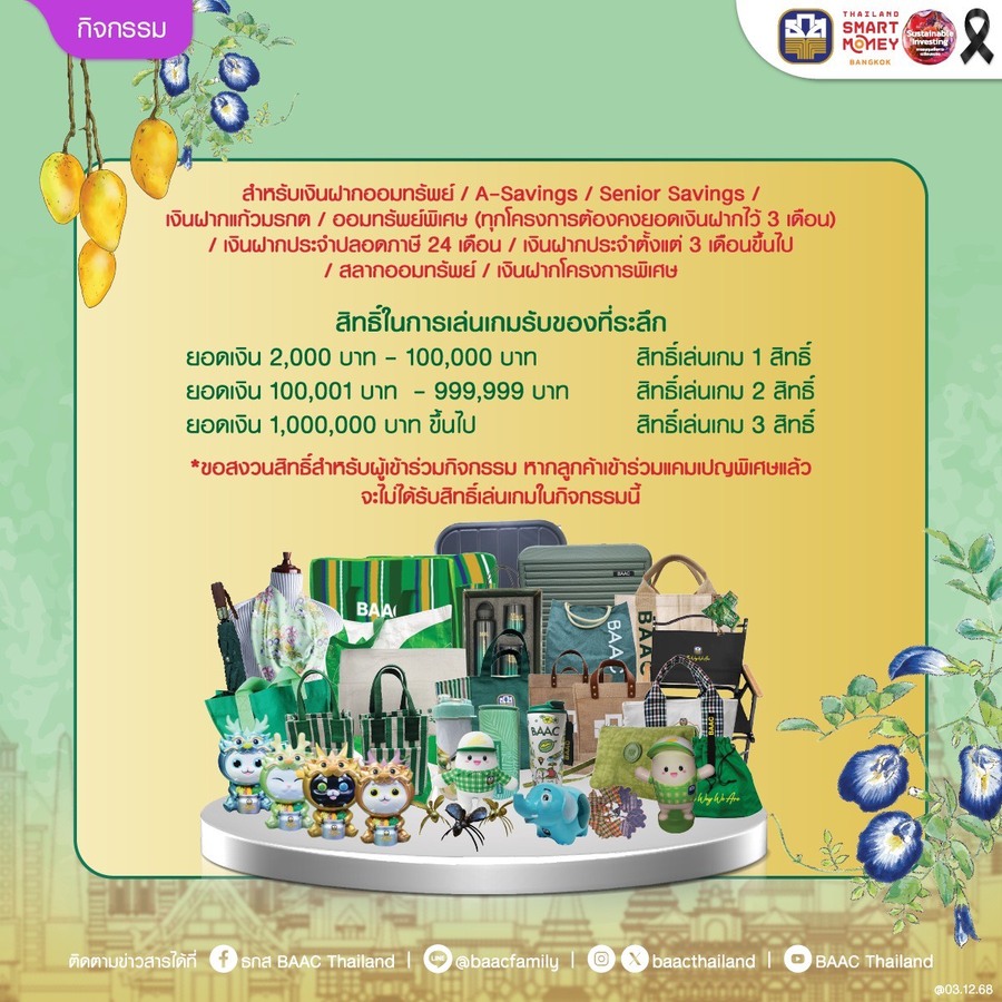 วันที่ : 04/12/2568 09:11 นายไพศาล หงษ์ทอง รองผู้จัดการธนาคารเพื่อการเกษตรและสหกรณ์การเกษตร (ธ.ก.ส.) เปิดเผยว่า ธ.ก.ส. เสิร์ฟโปรโมชันพิเศษพร้อมบริการการเงินแบบครบวงจรภายใต้ธีม Essence of Agriculture เข้าร่วมงาน Thailand Smart Money กรุงเทพฯ ครั้งที่ 16 อาทิ ผลิตภัณฑ์เงินฝาก – เงินฝากแก้วมรกต ฝากเริ่มต้นเพียง 2,000 บาท รับผลตอบแทนเป็นดอกเบี้ยเงินฝาก แถมสิทธิประโยชน์ความคุ้มครองอุบัติเหตุสูงสุดถึง 25 เท่าของยอดเงินฝากคงเหลือ วงเงินคุ้มครองสูงสุดไม่เกิน 10 ล้านบาท พิเศษ เมื่อฝากตั้งแต่ 6,000 บาทขึ้นไป และคงยอดไว้ 3 เดือน คู่กับฝากสลากออมทรัพย์ ธ.ก.ส. ชุดขุนแผนมรกต ตั้งแต่ 4,000 บาทขึ้นไป หรือฝากเงินฝากแก้วมรกต ตั้งแต่ 10,000 บาทขึ้นไป และคงยอดไว้ 3 เดือน รับทันที พวงกุญแจมังแมว เมื่อฝากตั้งแต่ 200,000 – 499,999 บาท รับสิทธิ์จุ่ม Art Toy มังแมว จำนวน 1 จุ่ม ฝากตั้งแต่ 500,000 – 999,999 บาท รับสิทธิ์จุ่ม Art Toy ชุด Agri Animal จำนวน 1 จุ่ม