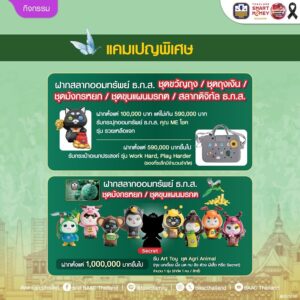 เมื่อฝากสลากออมทรัพย์ ธ.ก.ส. ชุดขุนแผนมรกตหรือชุดมังกรหยก ตั้งแต่ 1,000,000 บาทขึ้นไป รับสิทธิ์จุ่ม Art Toy ชุด AGRI ANIMAL (ทุย นกเอี้ยง ผึ้ง มด กบ ลิง ด้วงกว่าง ผีเสื้อและ ตัว Secret) จำนวน 1 จุ่ม (จำกัด 1 คน/สิทธิ์) ซึ่งเปิดตัว Art toy ตัว Secret ในงานนี้เป็นครั้งแรก หรือเมื่อฝากสลากออมทรัพย์ ธ.ก.ส. ชุดขุนแผนมรกต หน่วยละ 2,000 บาท ชุดมังกรหยก หน่วยละ 100 บาท ชุดถุงเงิน หน่วยละ 100 บาท ชุดขวัญถุง หน่วยละ 20 บาท หรือสลากดิจิทัล ธ.ก.ส. หน่วยละ 50 บาท ตั้งแต่ 100,000 บาท แต่ไม่เกิน 590,000 บาท รับกระปุกออมทรัพย์ คุณ ME โชค รุ่นรวยเหลือแจก หรือเมื่อฝากตั้งแต่ 590,000 บาทขึ้นไป รับเลยกระเป๋าอเนกประสงค์ รุ่น Work Hard, Play Harder