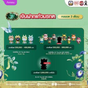 และเมื่อฝากตั้งแต่ 1,000,000 บาทขึ้นไป รับ Art Toy ชุด Agri Animal ตัว Secret จำนวน 1 ตัวหรือเมื่อฝากตั้งแต่ 20,000 บาทขึ้นไป และคงยอดไว้ 3 เดือน พร้อมสมัครบัตรเดบิตแบบมีประกัน (พลอยไพฑูรย์ หรือบุษย์น้ำทอง) รับเพิ่มสลากออมทรัพย์ ธ.ก.ส. ชุดมังกรหยก มูลค่า 100 บาท ด้านสลากออมทรัพย์ อาทิ สลากออมทรัพย์ ธ.ก.ส. ชุดขุนแผนมรกต หน่วยละ 2,000 บาท ลุ้นโชคใหญ่ทุกเดือน มูลค่า 40 ล้านบาท และรางวัลอื่น ๆ รวมมูลค่ากว่า 72 ล้านบาทต่อเดือน ถึง 24 ครั้ง เมื่อฝากครบ 2 ปี ได้รับดอกเบี้ยทันทีหน่วยละ 19 บาท หรือคิดเป็น 0.475% และฝาก 1,000 หน่วยขึ้นไป การันตีถูกรางวัลทุกงวด สลากออมทรัพย์ ธ.ก.ส. ชุดมังกรหยก หน่วยละ 100 บาทที่ให้ทั้งผลตอบแทนและสิทธิ์ลุ้นรางวัลใหญ่ทุกเดือน