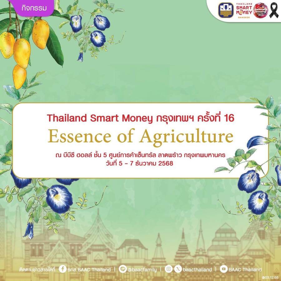 ธ.ก.ส. เสิร์ฟโปรโมชันพิเศษพร้อมบริการการเงินแบบครบวงจรภายใต้ธีม Essence of Agriculture เข้าร่วมงาน Thailand Smart Money กรุงเทพฯ ครั้งที่ 16 ณ บีซีซี ฮอลล์ ชั้น 5 ศูนย์การค้าเซ็นทรัล ลาดพร้าว กรุงเทพฯ วันที่ 5-7 ธันวาคมนี้